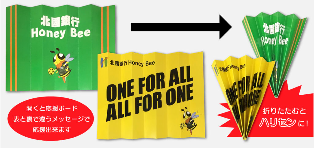 「応援ハリセン」はメッセージボードとして表と裏で違うメッセージをかかげたり、折りたたむとハリセンになりパンパンたたいて応援したりすることが出来る人気の応援グッズです。